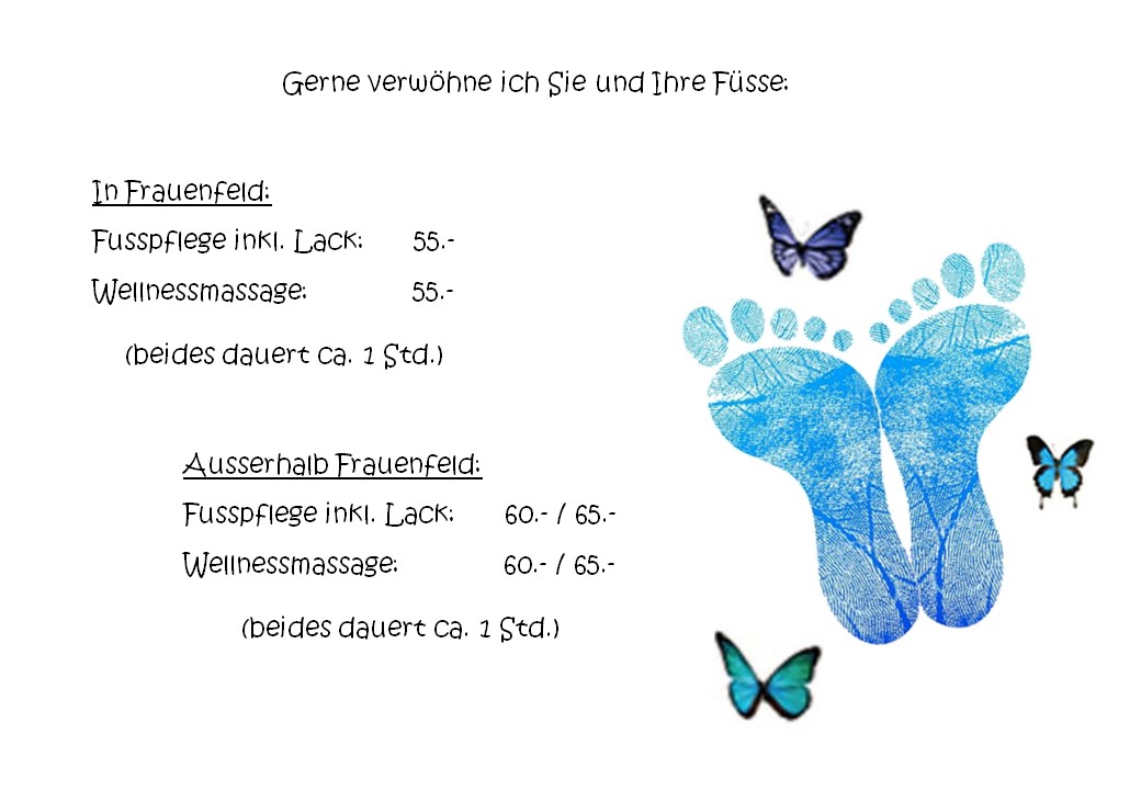 Gerne möchte ich Menschen mit Handicap, älteren Menschen, Sturmfamilien die nicht einfach so eine Stunde weg können und Menschen die sich gerne zu Hause die Füsse pflegen lassen und sich so etwas Gutes tun möchten, dies zu ermöglichen.