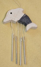mit blauem Band umwickelt und 3 schönen silbernen Klangstäben daran.